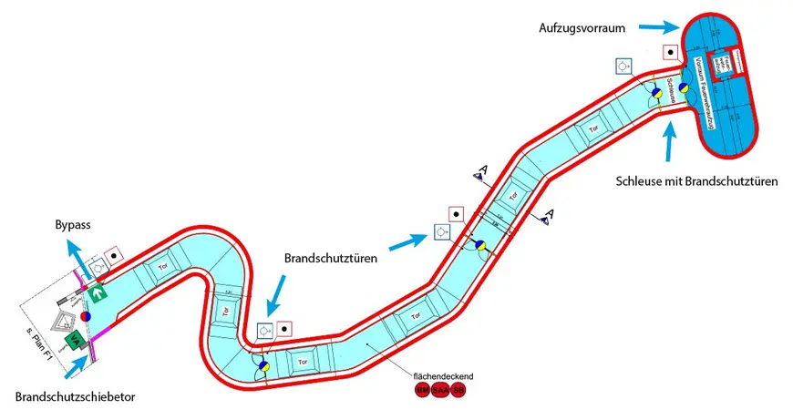 To compensate for these deficits, the tunnel was equipped with fire seals, the lift was designed as a firefighters' lift, and dynamic escape routing was put in place.