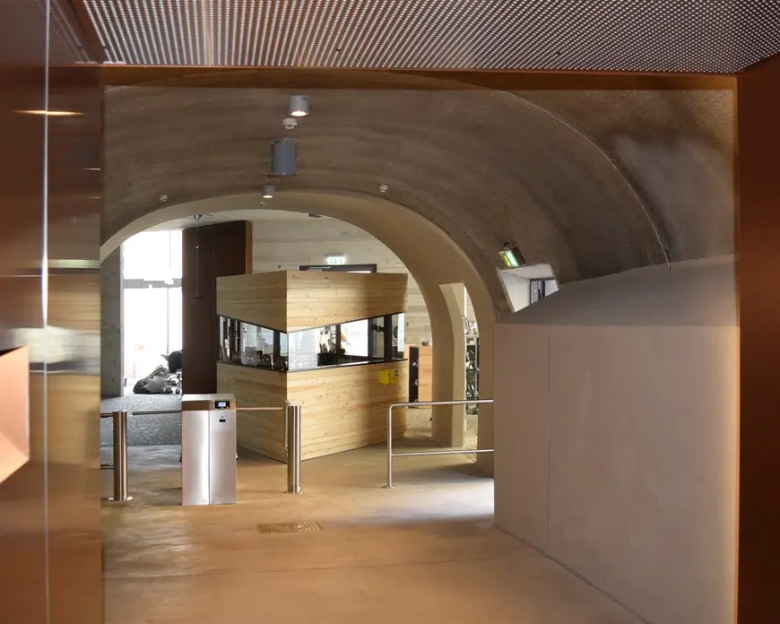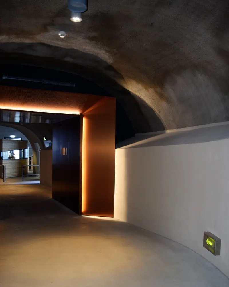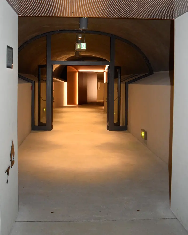 The tunnel is split into three sections with two fire seals, and separated from the area in front of the lift by a lock system. The firefighters' lift gives the fire service access to the tunnel from the castle in an emergency. To ensure the functional reliability of the firefighters' lift, a protective smoke pressure system was provided in the lift shaft and the area in front of it. The dynamic escape routing system – comprising dynamic emergency exit luminaires at head height and low-location dynamic arrows – indicate the escape route to be used in each case. The lights flash to attract increased attention. A fire alarm system that monitors the entire area controls the dynamic escape routing.