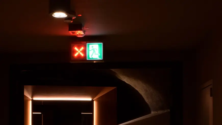 In such cases, dynamic escape routing is helpful. It is controlled by a fire alarm system. Emergency exit luminaires with a variable indication of direction visually close off the affected areas and indicate alternative escape directions. For people inside a smoke-filled area, low-location luminaires with direction signage offer the necessary lighting and way guidance for them to be able to leave the affected area by the shortest route.