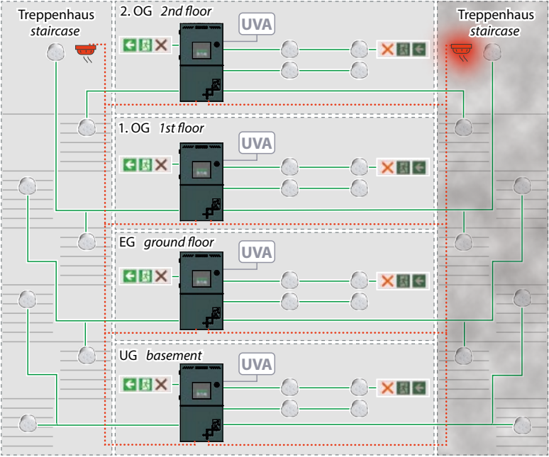 Mittelpunkt des dezentralen Anlagenkonzepts ist die autarke Betrachtung der Brandabschnitte: Die gesamte Sicherheitsbeleuchtung wird nur innerhalb des jeweiligen Brandabschnitts versorgt.