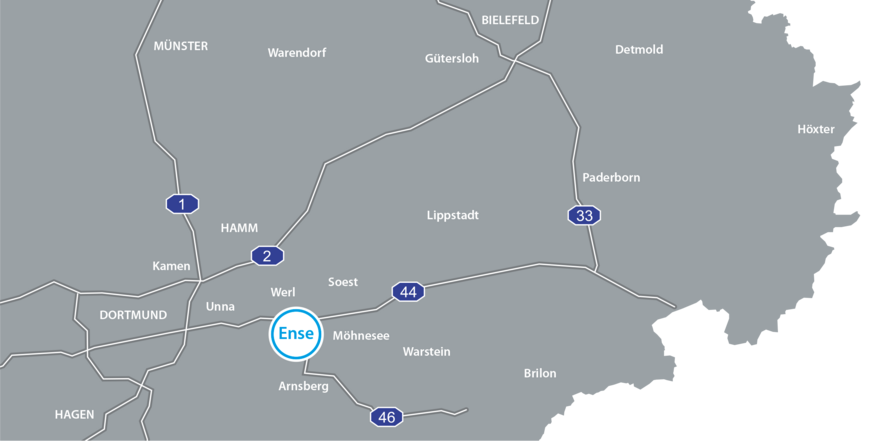 The municipality of Ense is located on the northern edge of the Sauerland, on the south-western edge of the Soester Börde and consists of a total of 14 districts. The municipality, which has a population of over 12,000 and an area of 51.08 km², is located in the west of the district of Soest, which in turn belongs to the administrative district of Arnsberg in the state of North Rhine-Westphalia.