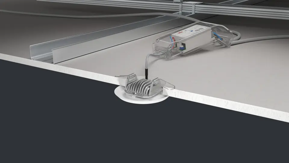The INOTEC LED driver can be installed directly into the ceiling – completely without tools, making it particularly convenient for the installer. The standard 68 mm ceiling cut-out serves as a proven standard and ensures smooth integration into existing installation processes. Once the driver has been mounted, the luminaire is simply inserted into the ceiling cut-out via its springs and securely fixed in place. The result: time-saving, reliable and professional installation that optimally combines efficiency and ease of use.