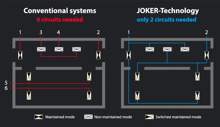 - The Joker-technology reduces the number of circuits required. Our sample needs only 2 final end circuits to feed the same number of luminaires due to the fact that the operation of all switching modes on one circuit is possible.
