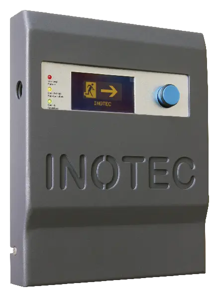 It includes one line to connect 64 INOTEC single-battery luminaires. A second line is optional to connect further 64 single-battery luminaires or a RTGBus-Card is available for a connection to SVPC.