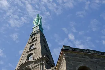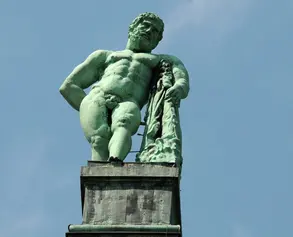 From the highest point in a landscape of cascades, Hercules dominates Kassel’s Bergpark Wilhelmshöhe. The copper statue of the Greek demigod stands on the apex of a pyramid, which in turn stands on an octagonal building known as the Riesenschloss. Today the name “Hercules” refers not only to the statue but to the whole monument, which stands 70.5 metres high. The octagon is 32.65 metres high, the pyramid 29.60 metres and the figure of Hercules 8.25 metres.
