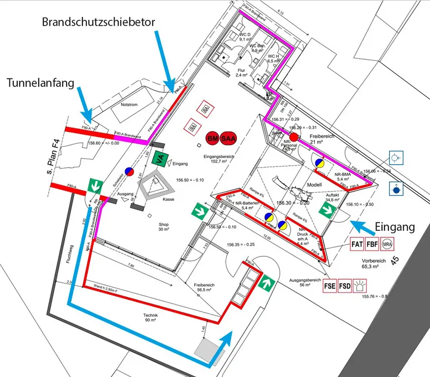 To compensate for these deficits, the tunnel was equipped with fire seals, the lift was designed as a firefighters' lift, and dynamic escape routing was put in place.