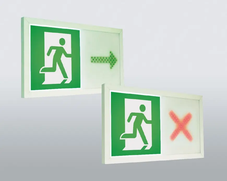 However, optical dynamic escape routing is essentially only an addition to conventional emergency and safety lighting, and cannot replace the latter. In the event of a power cut, safety lighting connected to an automatically triggered power supply for safety systems ensures the illumination of specific areas (escape routes, assembly rooms, etc.) with a specified illuminance. It is also responsible for lighting or backlighting emergency exit luminaires and direction signs signposting an escape route. However, this signage cannot react to danger by altering the direction sign. On the contrary, it can point in the wrong direction, in other words into the danger zone.