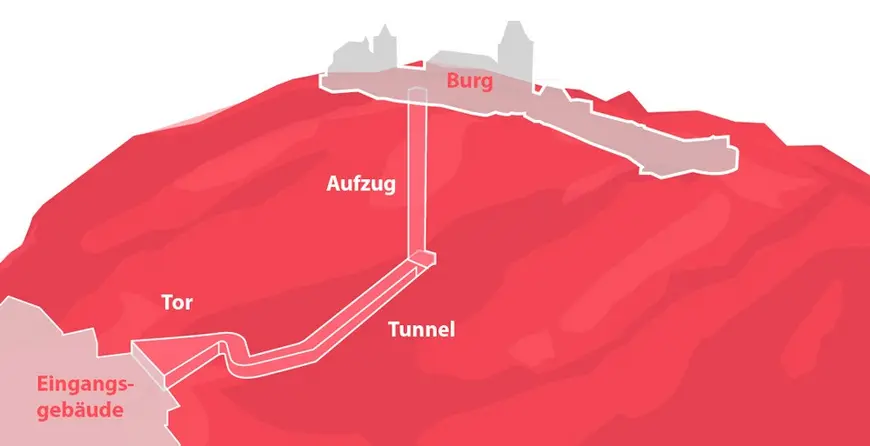 The town of Altena, in North Rhine-Westphalia, was planning to build a pedestrian tunnel with lift to provide access to Altena Castle. The entrance building leading to the tunnel is located in the town and is reached across a public traffic area. The tunnel is around 93 m long, with a lift at the end to take visitors up to the castle.