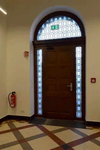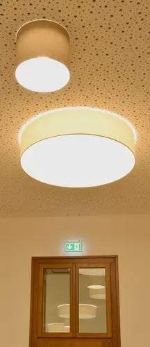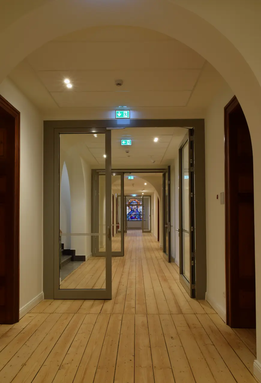 Of course, the regulations and the safety of the people were taken into consideration during the renovation. During the planning phase, the design and functionality of the SNP 1520 ES luminaire from INOTEC’s “Straight Line” series proved convincing. ES stands for “flush-mounted cable”: The homogeneously illuminated and dimmable pictogram is suspended from thin tension-carrying stainless steel cables and is thus very discreet. In the opening phase, this choice already proved to be spot on. Due to several cases of theft, a fire door was converted into a lockable door, for greater security. As a result, the escape route signage also had to changed at a later date. This was no problem at all, as it was very easy to replace the pictograms on the luminaires used. Another advantage: The control gear itself disappears into the ceiling, so there is no built-up, visible housing – this is ideal for a listed, historic building like the former Franciscan monastery. Markus Ende also emphasizes: “The safety lighting is very well integrated here and, although it’s of course highly visible, it’s not perceived as a foreign body.”