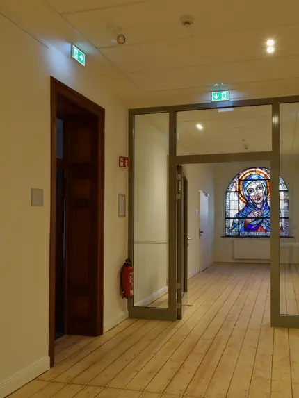 A pilgrims’ hall for a good 160 people has been built in this former monastery building. The entrance area has been designed to be barrier-free. There are now 80 sleeping places for pilgrims. In the four-bed room with a shared bathroom, you can stay overnight for a donation. Markus Ende explains: “ We are using a freely interpreted version of the Franciscans’ motto: He who has something, can give something, but who has nothing does not need to give anything.” Since motorized people also arrive here, on a motorcycle pilgrimage, for example, 29 parking spaces have been created as well as charging stations for e-cars and e-bikes. The complete conversion area of the former monastery is about 3,600 m² of living and usable space, including about 1,800 m² for the Marian pilgrimage Werl with administration and pilgrim accommodation. On another 350 m² there are two apartments for clergy. Overnight accommodation with 40 m² was created for two homeless people. By the way, another part of the old Franciscan monastery has remained in religious use as a convent. Ursuline sisters moved in because their previous convent had become too large for them. The living space for their convent covers 880 m². In addition, the office of the Dean for the Hellweg deanery is still housed in the building. The pilgrim convent is a self-catering house: “ We want the groups to use the gastronomy offered around us as much as possible, we don’t want to compete with that.”
