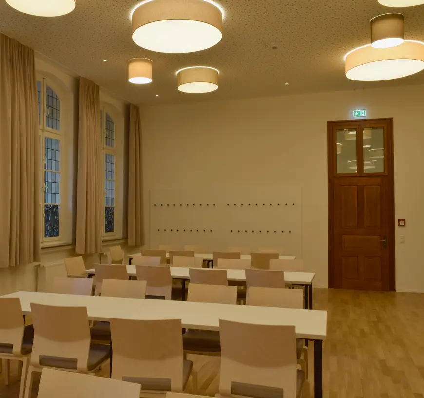 Work began shortly after the Franciscans left. The neighbouring printing house was demolished and an annex was built in its place. The exterior façade of the monastery was renovated and the roof renovated. In the process, the appearance was hardly changed in order to preserve the character of the listed building. On the west side, dormers that had existed in the past and had been removed over time, were rebuilt on the roof. The result is impressive: From the outside, the historic substance has been preserved, while on the inside, the building has been skillfully renovated. This not only delights Markus Ende, but also the visitors. The modern furnishings have been discreetly integrated into the interior, which has been kept in muted colours. The contractor Menne laid 90 kilometres of cable, installed fire protection alarm systems and WLAN is available throughout the building. Nothing of all this is visible – nothing flashes – the technology blends in almost invisibly. And that’s important, not only in the state-of-the-art, rentable meeting room. “The pilgrims can still be on the road living quite simply and with few possessions. They all carry a smart phone with them. That’s why every bed has a light console with a power socket, explains Markus Ende, who studied religious education.