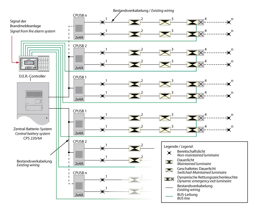 A BUS line connects the appliances to the TFT controller in the central power system and is used to control and monitor them. If the BUS line fails or is interrupted, the CPUSB systems automatically switch to secure operation and all the luminaires are switched on. This solution eliminated the need for extensive new cables.