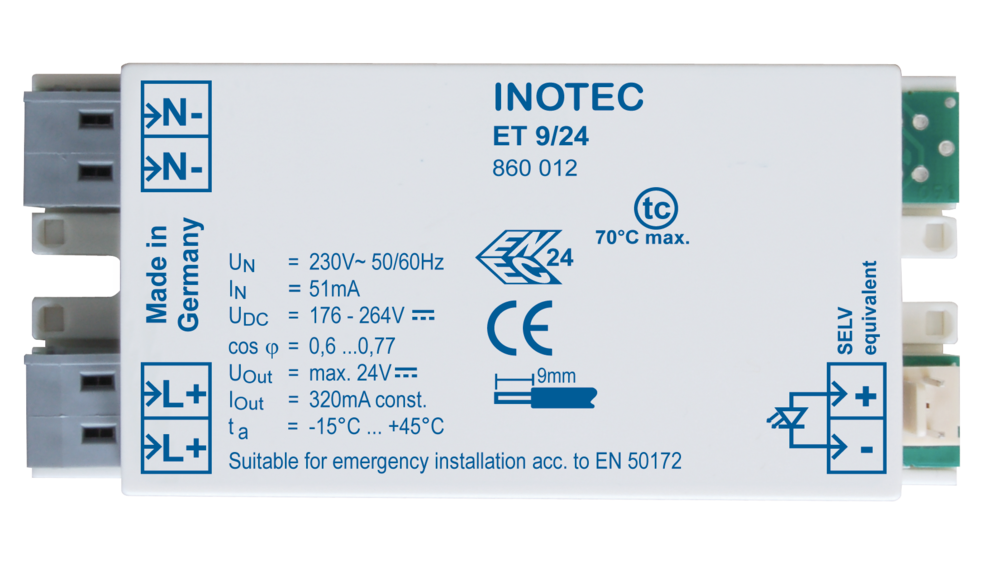 LED-Betriebsgerät zum Anschluss an 230V-Gruppen- und Zentralbatterieanlagen. Hohe Funktionssicherheit durch Einhaltung internationaler Standards zur Sicherheit und Arbeitsweise, elektromagnetische Verträglichkeit und Störsicherheit.