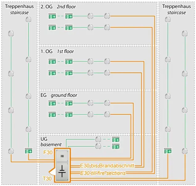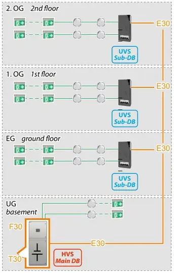 Das CPS-Gerät wird in einem eigenen Raum mit Funktionserhalt untergebracht. Ein wesentlicher Nachteil dieses Konzepts: Bei Unterbrechung der E30-Leitung an einer beliebigen Stelle fällt in allen nachgeschalteten Bereichen die Sicherheitsbeleuchtung komplett aus. Ein Nachteil, der sich dadurch kompensieren bzw. einschränken lässt, dass die Stromkreise einzeln in die jeweiligen Brandabschnitte verlegt werden (Bild 2) oder die Versorgung der Unterstationen sternförmig von der CPS erfolgt. Beides führt allerdings zu einem erheblich größeren Aufwand an Funktionserhalt. Bei der Auswahl der Leitungsquerschnitte ist auch zu beachten, dass durch den Anstieg des spezifischen elektrischen Widerstands im Brandfall ein deutlich größerer Leitungsquerschnitt vorgesehen werden muss als bei Leitungen ohne erforderlichen Funktionserhalt.