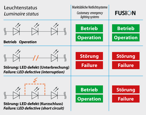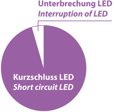 Der zunehmende Einsatz der LED-Technik bringt nicht ausschließlich Vorteile mit sich: Führte früher der Ausfall einer Leuchtstofflampe in der Regel auch zum Abschalten der vorgeschalteten Betriebsgeräte und folglich zu einer Fehlermeldung des Sicherheitsbeleuchtungssystems, ist das bei LEDs nicht selbstverständlich. Deutlich weniger als 3 % der LEDs fallen durch Unterbrechung aus und würden dadurch zu einer sicheren Fehlermeldung führen. Bei mehr als 97 % der LEDs ist ein Kurzschluss die Ausfallursache (Bild 6). Sind mehrere LEDs in Reihe geschaltet oder im Fall einer Kombination aus einer Reihen-Parallelschaltung von LED-Strängen, fällt der Kurzschluss selbst mehrerer LEDs nicht auf, da weiterhin ausreichend Strom am Ausgang des Betriebsgeräts fließt und die noch intakten LEDs die ausgefallenen durch eine erhöhte Helligkeit optisch kompensieren würden. Für LED-Sicherheits- und -Rettungszeichenleuchten optimierte Betriebsgeräte können durch probate Messverfahren Ausfälle durch Kurzschluss oder Unterbrechung erkennen und umgehend eine Leuchtenstörung melden.