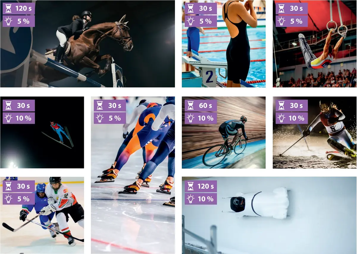 | Eisschnelllauf | 30 s | 25 lx | 0,35 | 10 lx | 0,25 | 5 lx | 0,25 |