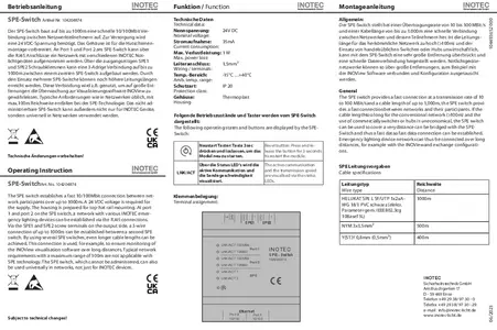 Der SPE-Switch baut auf bis zu 1.000 m eine schnelle 10/100-Mbit-Verbindung zwischen Netzwerkteilnehmern auf. Zur Versorgung des für die Hutschienenmontage vorgesehenen SPE-Switch wird eine 24-V-DC-Spannung benötigt. An Port 1 und 2 kann über die RJ45-Anschlüsse ein Netzwerk mit verschiedenen INOTEC Notlichtgeräten aufgebaut werden.