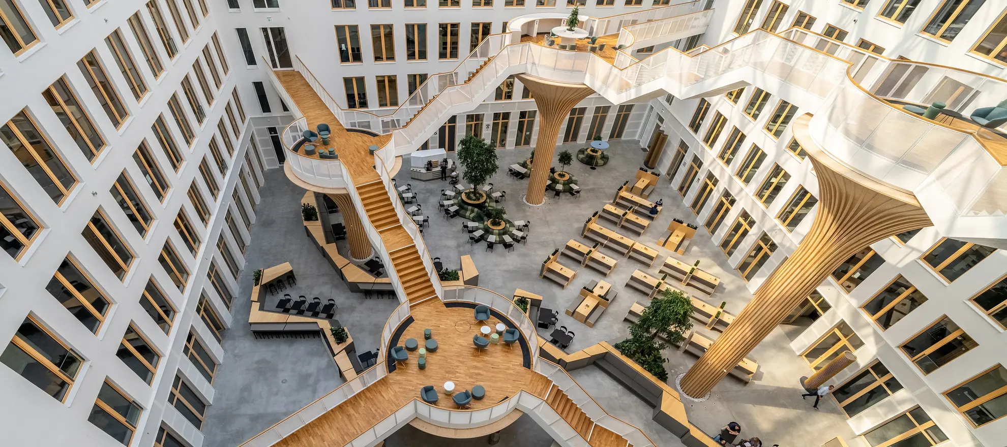 Das moderne Büro bietet flexible Arbeitszeitmodelle und die Möglichkeit gemeinsamer Schreibtisch-Nutzung. Demzufolge sind auf allen Etagen von EDGE Südkreuz rund um den offenen Atriumbereich Räume für Kommunikation, Rückzugsmöglichkeiten zum Brainstormen, Konferenzzimmer zur Teamarbeit und Bereiche für den informellen Austausch vorhanden – kombiniert mit Lounges und Cafés. Auch auf digitale Nachhaltigkeit wurde geachtet: Intelligente, maßgeschneiderte Technologien erlauben es, an den Arbeitsplätzen mit höchster Effizienz zu arbeiten.