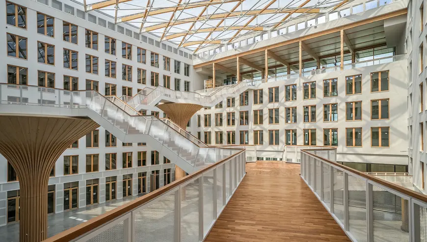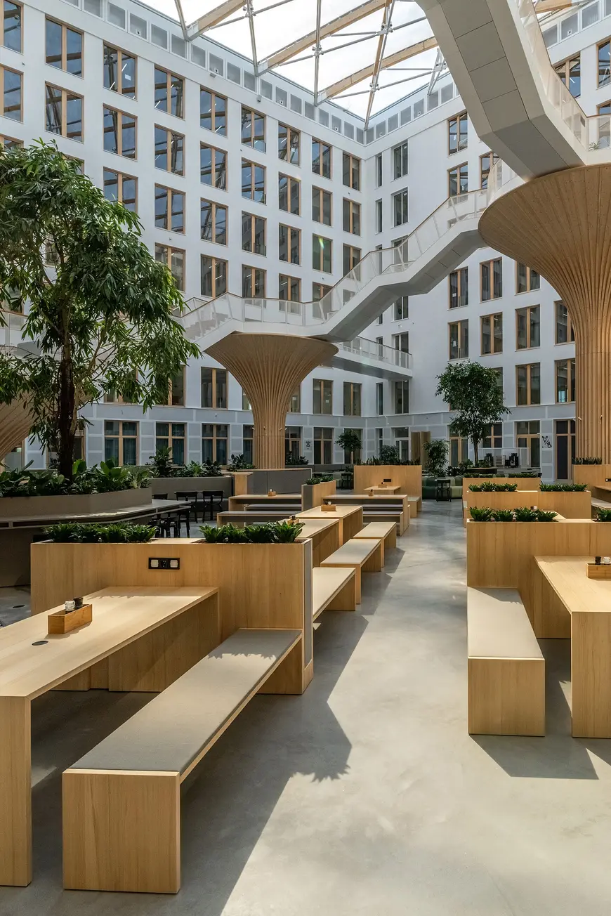 EDGE Südkreuz Berlin, erbaut von TCHOBAN VOSS ARCHITEKTEN, ist ein Büroensemble aus zwei Gebäuden. Es handelt sich um eine modulare Holz-Hybrid-Konstruktion, die als offenes Ökosystem mit naturbasierten Architektur-
