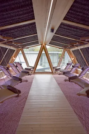 Das Prunkstück im Kurpark Bad Sassendorf ist das 2019 neu errichtete Gradierwerk. Es lädt in einzigartiger Architektur mit salzhaltiger Luft zum Durchatmen ein. Beim Verdunsten des Salzwassers gelangen geringe Salzteilchen in die Luft. Als Freiluft-Inhalation bildet die angereicherte Luft ideale Voraussetzungen für eine medizinische Anwendung. Ein Teil des Gradierwerks ist in den Saunabereich der Börde-Therme integriert.