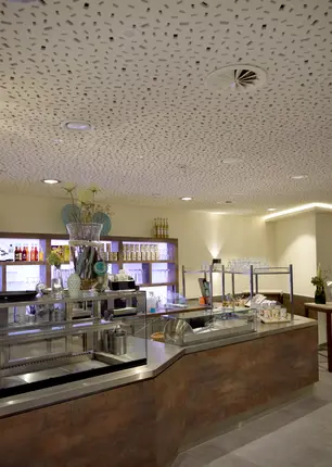 In anderen Bereichen, wie dem Bistro, dem Ruhebereich oder im überdachten Außenbereich, wurden zur Ausleuchtung der Flucht- und Rettungswege die unauffälligen Deckeneinbauleuchten vom Typ SN 9400 genutzt. Diese Leuchtenserie bietet durch den Einsatz unterschiedlicher Sekundäroptiken immer die optimale Lösung für die normkonforme Ausleuchtung bei einer möglichst geringen Stromaufnahme. Der Anwender kann dabei zwischen symmetrischer und asymmetrischer Ausleuchtung bzw. niedriger oder hoher Montagehöhe wählen. Zudem gibt es diese Serie auch für die Deckenaufbaumontage.