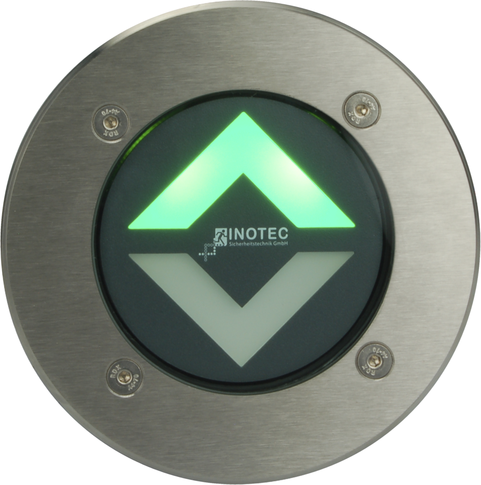 Dynamische Rettungswegsegmentleuchte für Bodeneinbaumontage zur Anzeige des sicheren Rettungsweges mittels Lauflichtfunktion in Abhängigkeit der Rauchausbreitung eines Brandes. Spannungsversorgung über PSU 48.