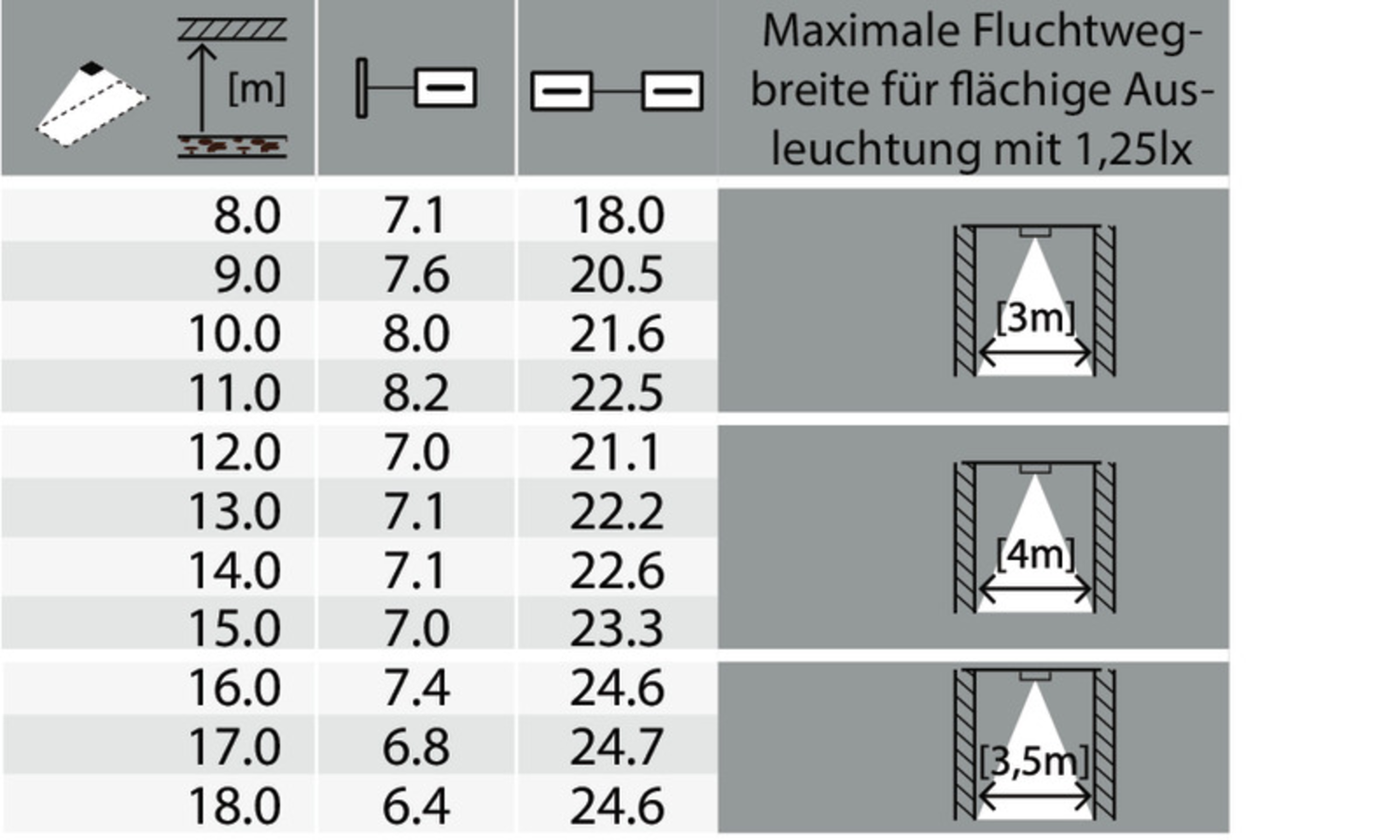 Asymmetrische, breit- und tiefstrahlende Lichtverteilung zur Ausleuchtung von Rettungswegen. Optimierte Lichttechnik für Lichtpunkthöhen bis 18,0m zur flächigen Ausleuchtung von Rettungswegen mit einer Breite von 3-4m. Maximal 24,7m Leuchtenabstand bei 1 lx auf der Mittellinie des Rettungsweges nach EN 1838 unter Berücksichtigung eines Wartungsfaktors von 0,8.