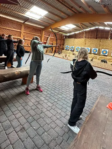 Am Donnerstag hatten wir die Gelegenheit, auf dem Hof Becker verschiedene Team-Building-Aufgaben zu lösen, wie zum Beispiel den Frögelturm oder den Bau einer Brücke. Unsere Gruppe wurde in zwei bzw. vier kleinere Teams aufgeteilt, um einen Wettbewerb daraus zu machen. Dabei war es wichtig, seinem Team Vertrauen zu schenken und auf den gewählten Teamleiter zu hören. Neben weiteren Spielen genossen wir ein gemeinsames Mittagessen, bei dem alle wieder zusammenkamen, bevor es zur großen Kletterwand des Hofes ging, an der sich jeder ausprobieren durfte. Am Ende des dritten Tages unternahmen wir gemeinsam Bogenschießen, bei dem wir mehrere Runden auf eine etwa 15 Meter entfernte Zielscheibe schossen.