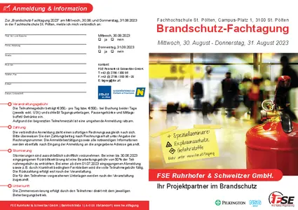 In diesem Jahr lädt die FSE Ruhrhofer & Schweitzer GmbH bereits zum 19. Mal zur Tagung ein. Die Veranstaltung richtet sich an alle im vorbeugenden Brandschutz tätigen Fachleute bei Behörden, Feuerwehren, Versicherungen, Ingenieurbüros, Sachverständigenbüros, Architekten und der Industrie.