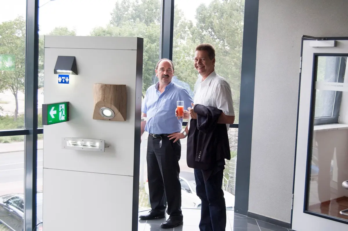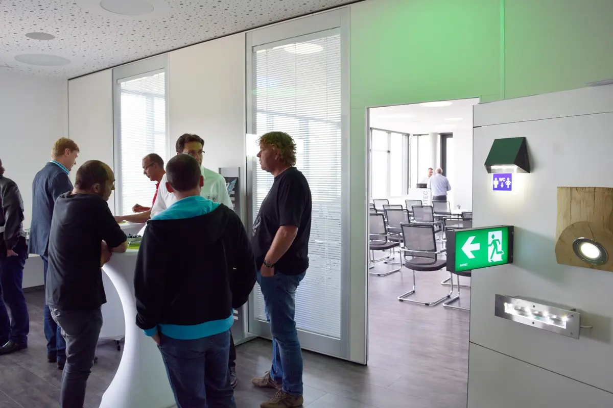 Die neu eingerichteten Vertriebszentren in Pinneberg, Potsdam, Nördlingen und Ense zeigten, mit welcher Kompetenz sie den Kunden bei der Planung von Not- und Sicherheitsbeleuchtungsanlagen vor Ort unterstützten können. Der technische Innendienst und die Servicemitarbeiter waren auch vertreten, so gab es für einige Besucher endlich ein passendes Gesicht zur Stimme am Telefon.